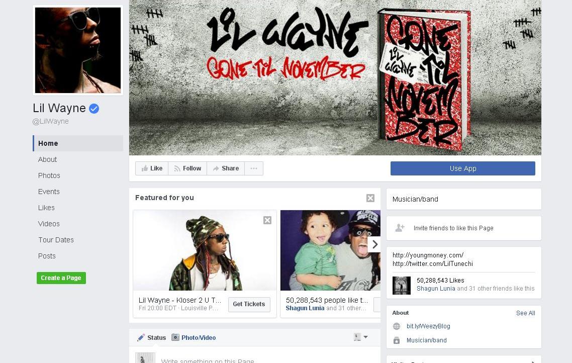 Entertainment 20 Most Liked Facebook Pages Saloni Bararia April 17, 2017 No Comments 12. Lil Wayne Advertisement Lil Wayne has 50, 288,543 fans on the most loved social networking site. Prev9 of 20Next